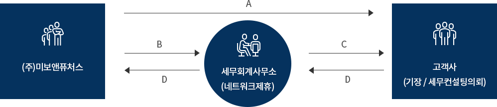 본사에서 엄선한 세무사/회계사(법인)님들과 네트워크를 구축하여 기존의 단순한 세무기장서비스만 제공하는 것이 아니라, 각각의 기업에 맞는 최신의 합법적인 절세솔루션 제공과 기업세무회계제도 정비는 물론 세무조사대응 전략 및 조세불복까지 자문해드리는 프리미엄 ‘종합경영자문형 세무·회계시스템’을 갖추고 있습니다.